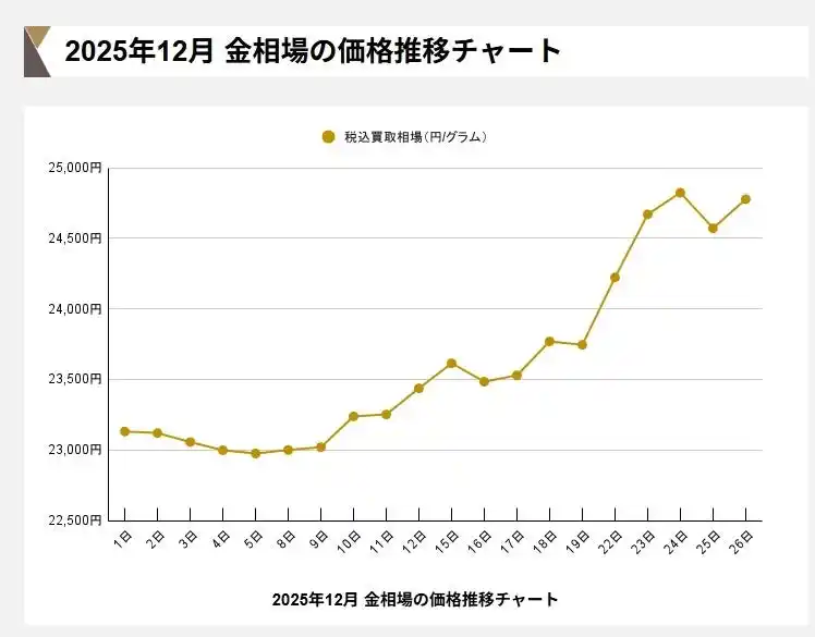 | 令和7年12月1日(月)の金相場は1gあたり23,131円でスタート。11月末に行われたFRB(米連邦準備理事会)による追加利下げは12月中旬にまで金相場を揺れ動かします。途中23,000円を切りましたが、12/8(月)に再び盛り返すと12/15には1gあたり23,614円にまで上昇。そして17日には、米国のトランプ大統領はベネズエラ政権を外国テロ組織に指定。同国に出入りする制裁対象のタンカーについて全面的な封鎖を命令したことで投資家たちを中心に地政学リスクへと意識が向きます。22日ではトランプ大統領のベネズエラとの戦争への言及は金への買いを流入させ、1gあたり24,000円を突破。年内にも25,000への到達も視野に入る勢いでしたが、最終営業日12/25のクリスマスは1g/24,571円で終えました。 | ||||||||||||
