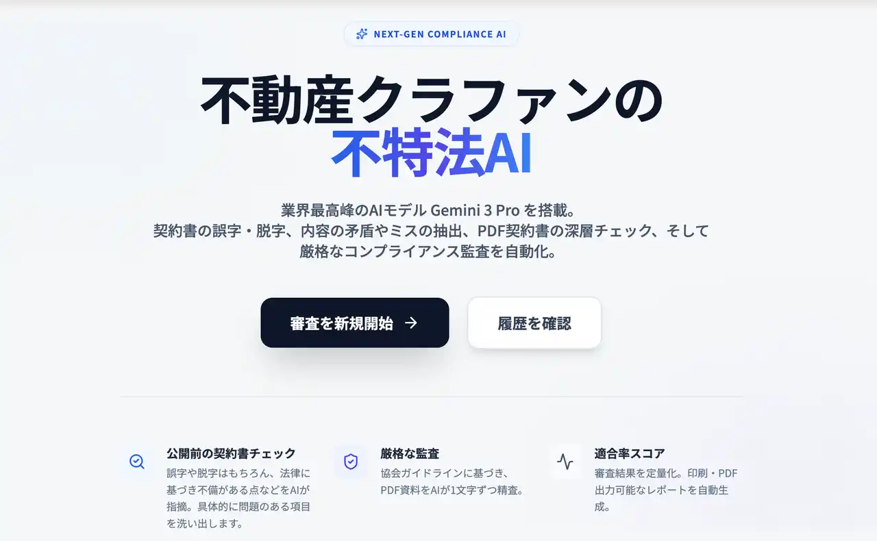 | 本アップデートでは、生成AIを活用した契約書監査機能「不特法AI」の搭載、およびデータベースのフルリニューアルによる「運用中の持分譲渡(セカンダリ取引)」への対応を実現。不動産クラウドファンディング(CF)専業で30社以上に選ばれてきた実績と信頼を基盤に、業界のさらなる信頼性向上と流動性革命をテクノロジーで牽引します。 | |||||||||