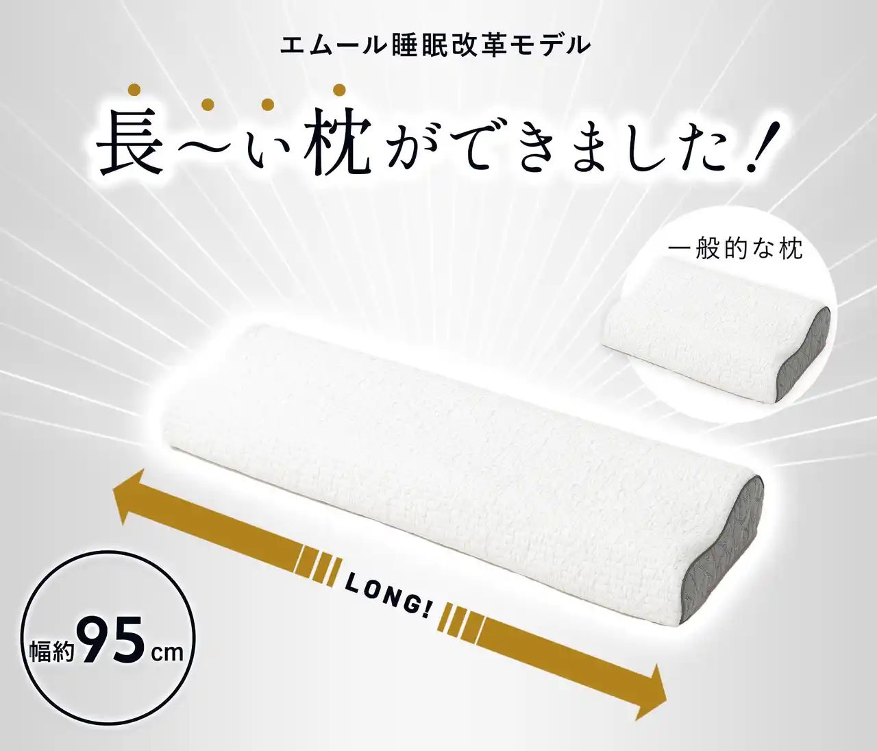寝返りのたびに頭の位置を気にする必要は、もうありません。超ロング設計の本商品は、多くの一般的な枕とは一線を画す“睡眠そのものを見直す”ための改革モデルです。エムールは、毎晩の眠りのお供に超ロング枕を提案します。 |