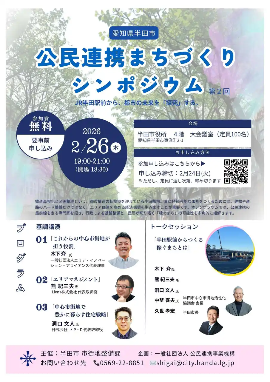 愛知県半田市にあるJR半田駅周辺では、鉄道高架化と土地区画整理事業という、都市構造の転換期を迎えています。真に持続可能なまちをつくるためには、建物や道路のハード整備だけではなく、エリアの価値を高める経済循環を生み出すことが重要です。本シンポジウムでは、公民連携の最前線を走る専門家を招き、行政による基盤整備と、民間が切り拓く「稼ぐまち」の可能性を多角的に紐解きます。 |