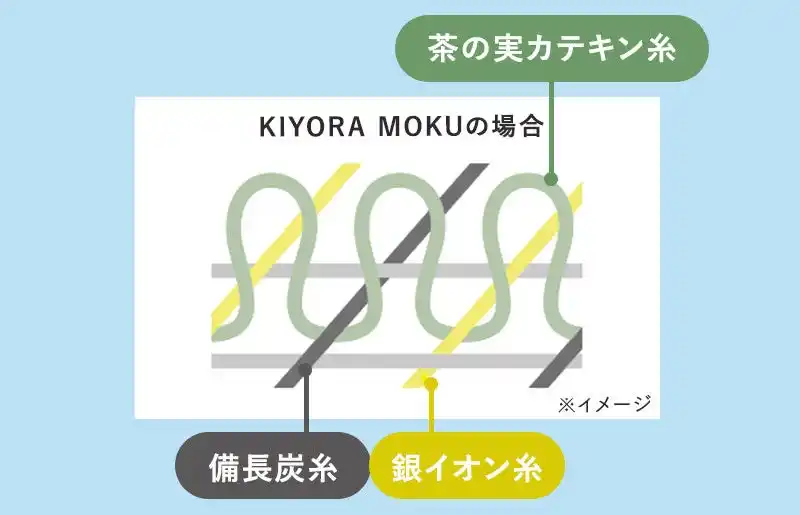 「KIYORA」は、抗菌・防臭・消臭機能を練り込みした3つの機能糸を組合せ、タオルそのものが臭いの原因菌の増殖を抑制する設計を採用しています。 |