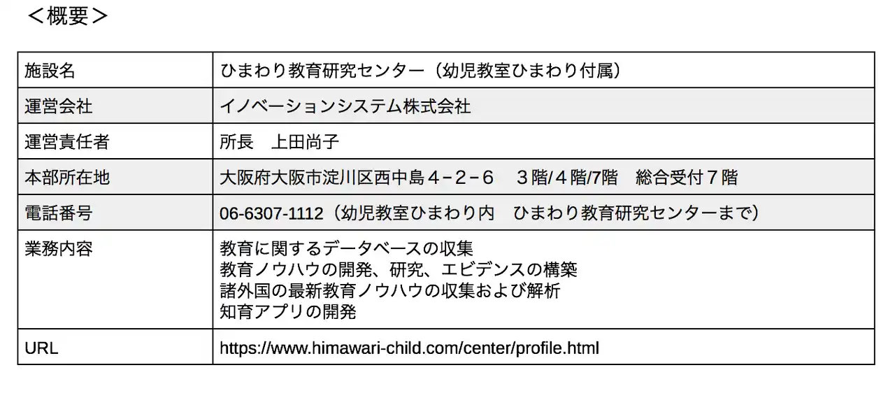 <リリースに関するお問い合わせ先> イノベーションシステム株式会社 ひまわり教育研究センター 所長 上田尚子 TEL 06-6307-1112 https://www.himawari-child.com/center/profile.html |