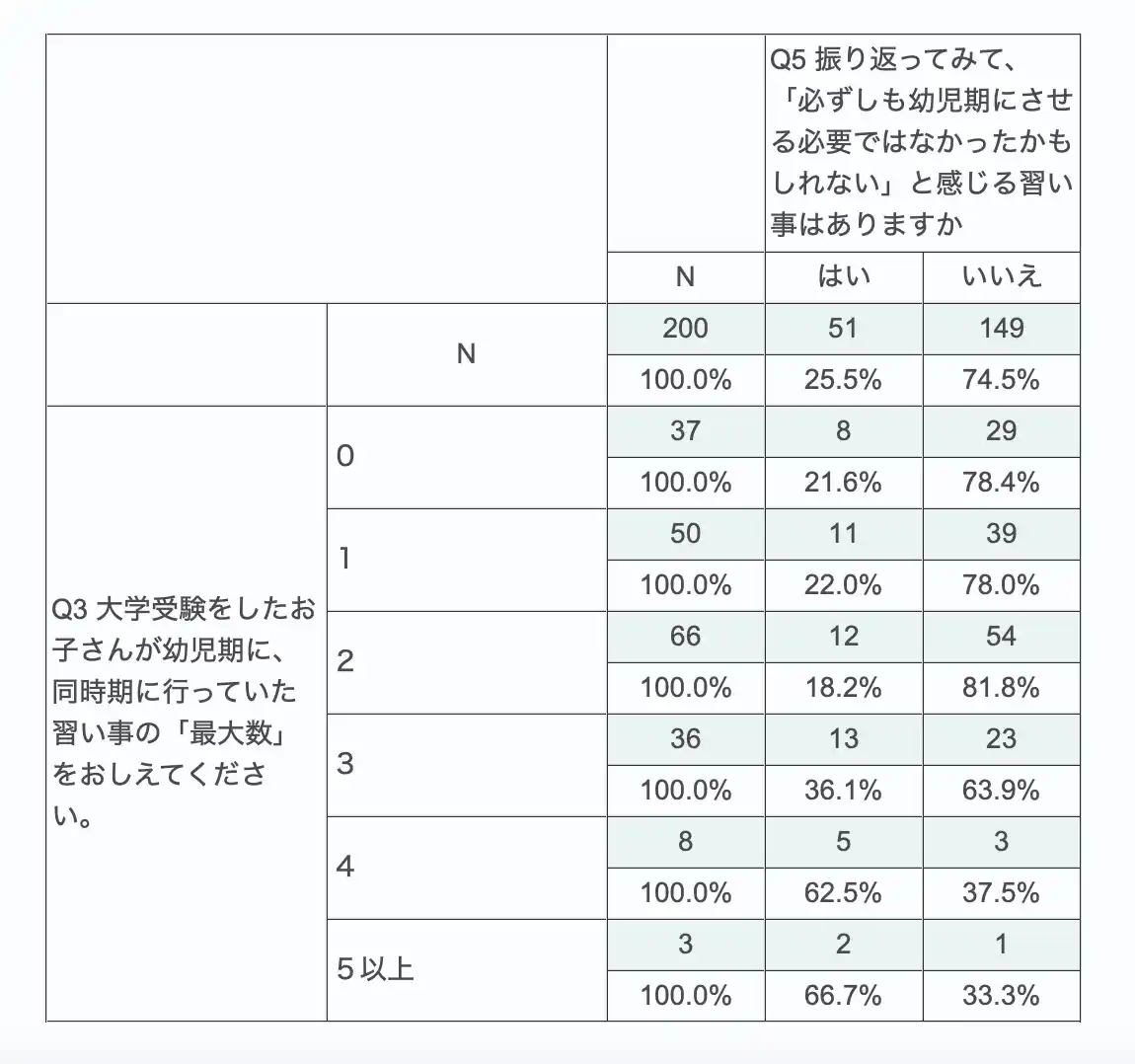 | 幼児期に同時期で行っていた習い事の最大数と後悔の有無を分析したところ、以下の傾向が見られました。 | |||