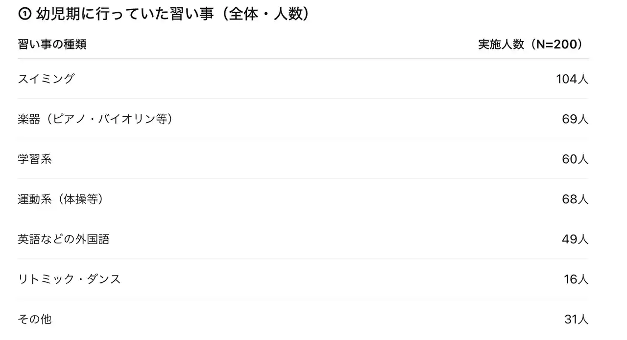 習い事別に人数で比較すると、「英語」は実施経験者49人中16人が「必ずしも必要ではなかった」と回答しており、他の習い事に比べて振り返りの対象になりやすいことが分かった。 一方、スイミングは実施人数が最多であるにもかかわらず、後悔の声は相対的に少なく、幼児期の習い事としての納得度の高さがうかがえます。 |