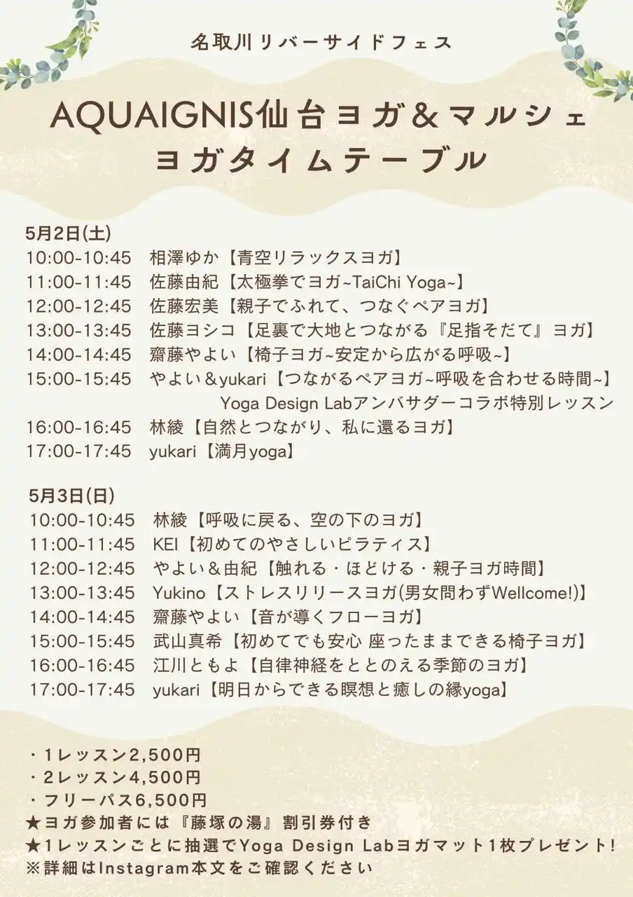 2026年5月2日(金)・3日(土)の2日間、アグニス仙台にて、Yoga Design Lab宮城代表アンバサダーYukariが代表を務めるヨガフェス「名取川リバーサイドフェス」を開催します。 思う存分ヨガを楽しめるほか、健康・食・交流をテーマにした多彩なブースも多数出展予定です。 |
