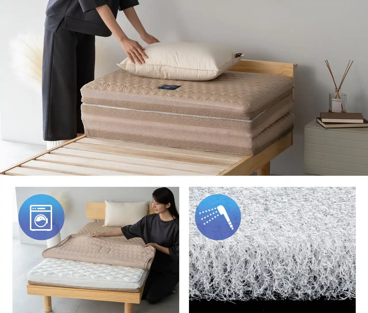 カバー・ベッドパッドは洗濯機で、中材はシャワー洗い可能。汗や汚れ、ホコリをため込みにくく、いつでも清潔な寝環境を保てます。カビが発生しやすい寝室環境の方や、子育て世帯やアレルギー対策を重視する方にもおすすめです。 |