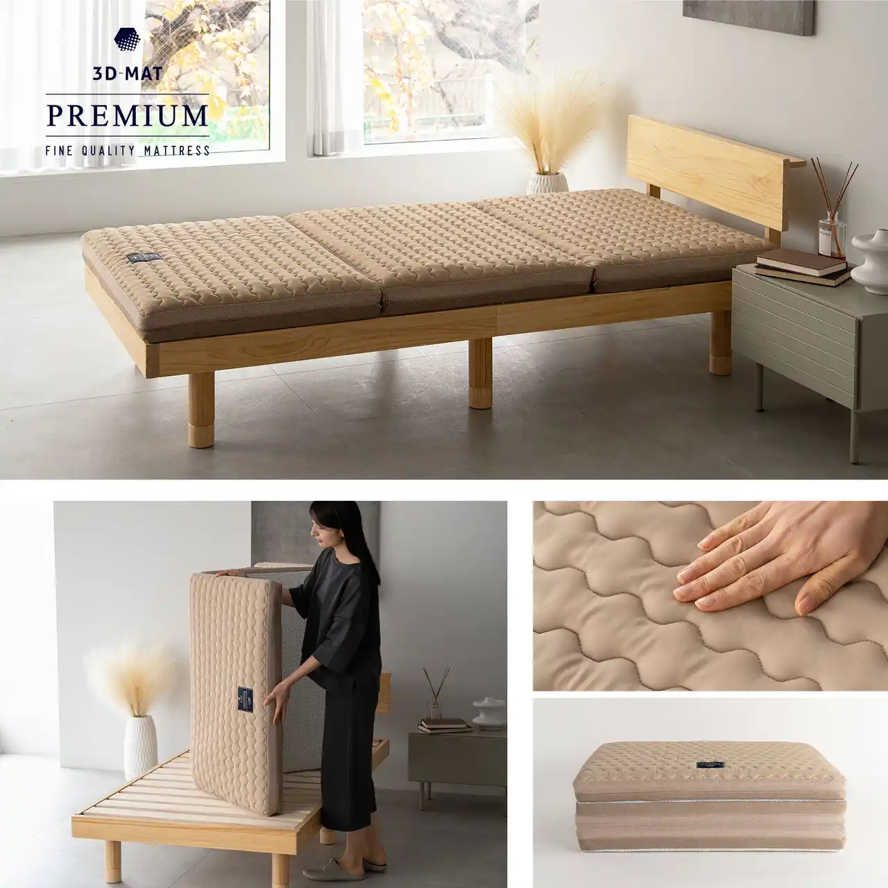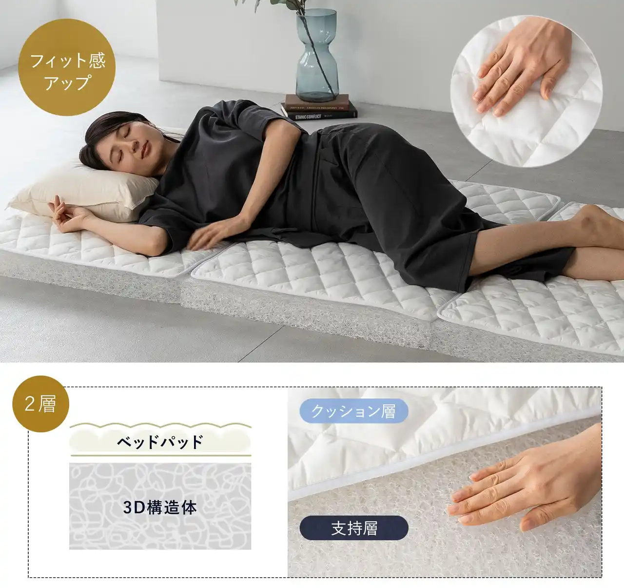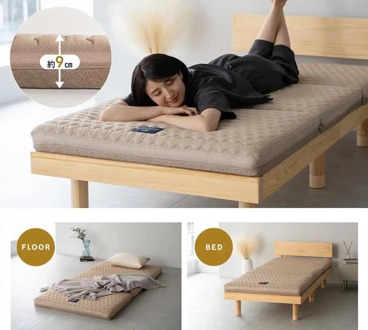 従来モデルより厚みを持たせた9cm構造で、底付き感を軽減。適度な反発力とクッション性をバランスよく備え、上位モデルにふさわしいプレミアムな寝心地を実現しました。また、三つ折りタイプのため、収納や移動がラクラク。和式布団としても、ベッドフレームでも使える万能設計です。毎日お布団を上げ下ろしする方にもおすすめです。 |