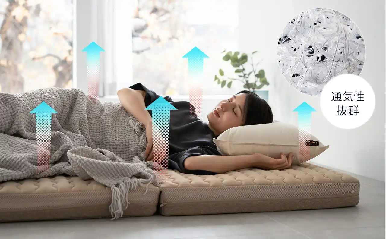 通気性に優れた3D構造体が、睡眠中にこもりやすい余分な熱湿気を効率よく逃がし、ムレを防止。 |