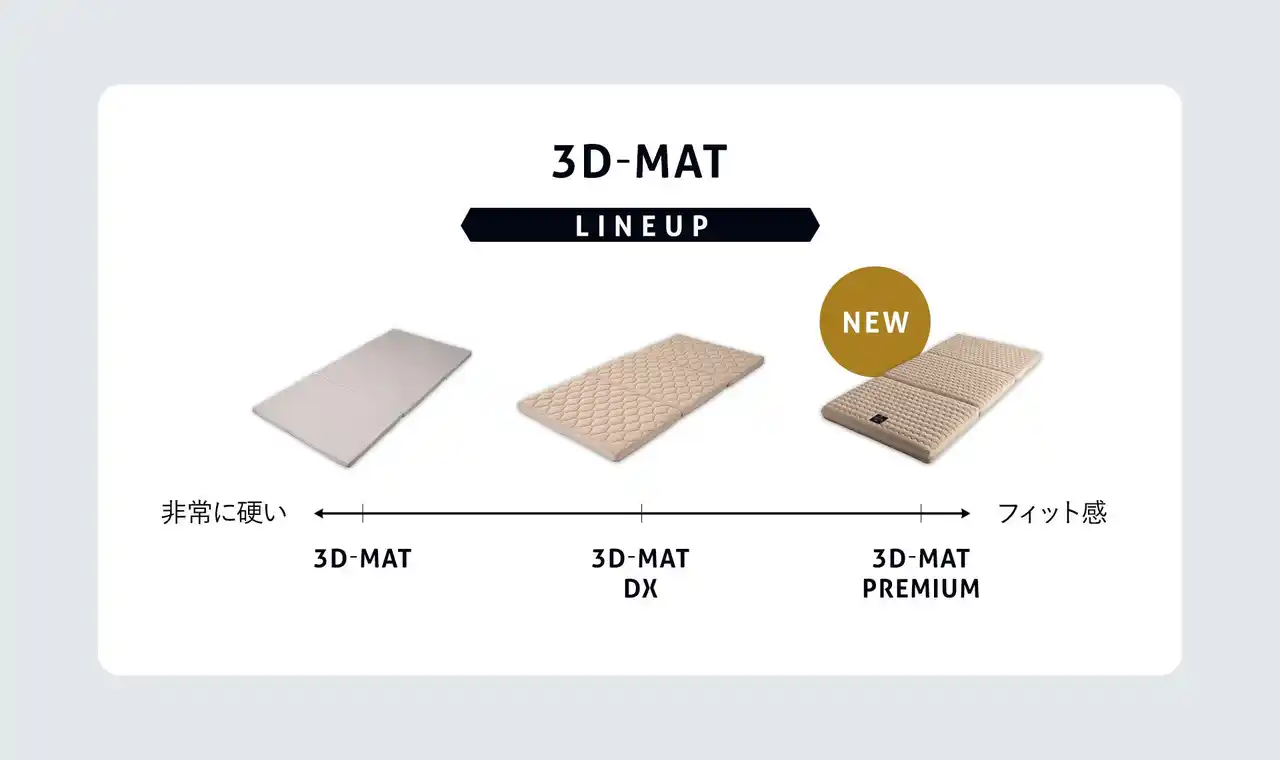 3D-MAT プレミアムは、3D構造体(3Dファイバー等)の硬さが苦手な方にもおすすめできる快適性を実現しました。 |