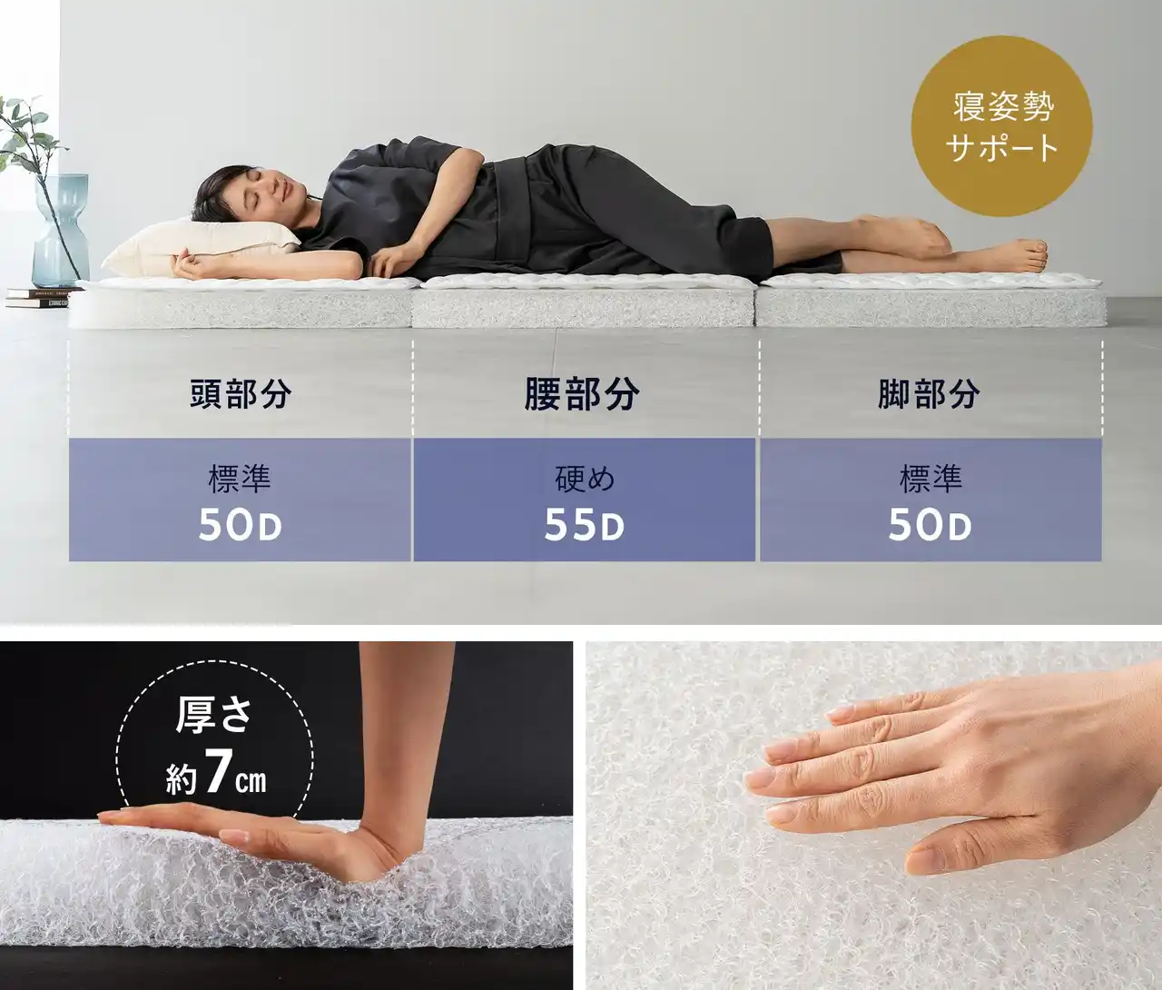 3D構造体ならではのしっかりとした反発力により、楽に寝返りが打てる設計。さらに、体重が最もかかる腰部分の密度を高めた設計で、沈み込みを抑制します。高反発の特性を活かしながら、腰が沈み込みすぎない安定した寝姿勢を保ち、身体への負担を軽減しながら快適な睡眠を支えます。 |
