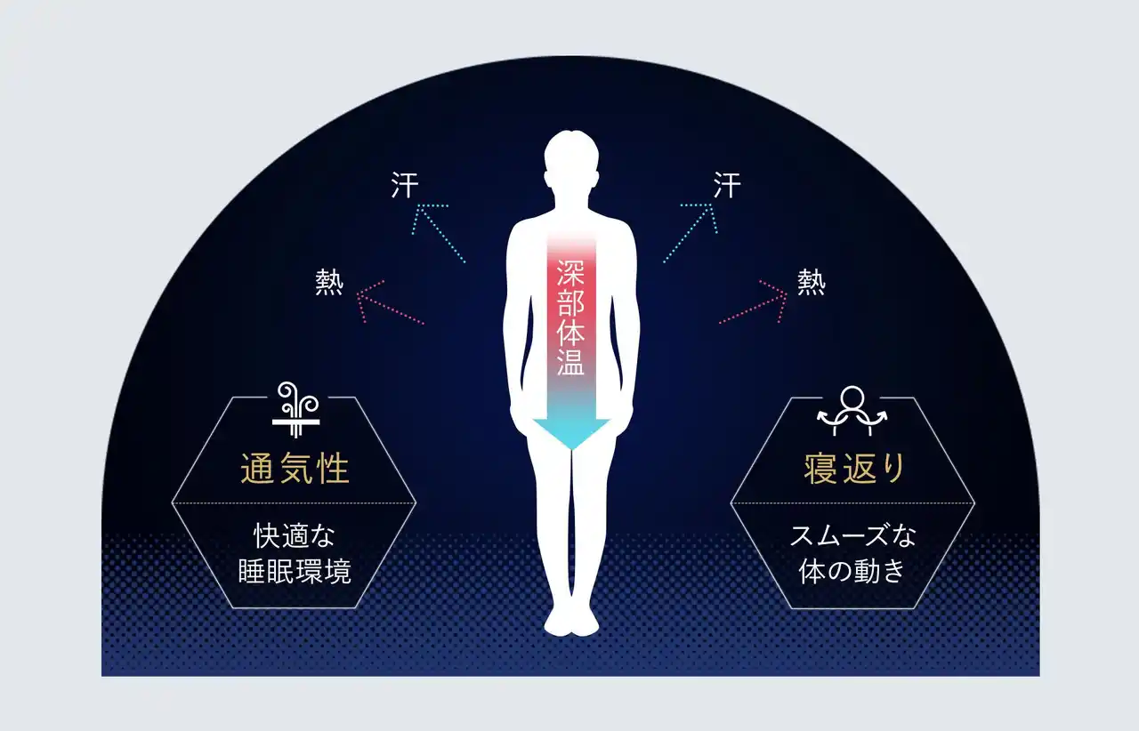 人は眠るときに、深部体温を下げることで、副交感神経が優位になり、リラックスして深い眠り(ノンレム睡眠)に入ります。マットレスの「通気性」と「寝返りのしやすさ」は、深い睡眠に必要な快適な睡眠環境のために重要な役割を担っています。 |