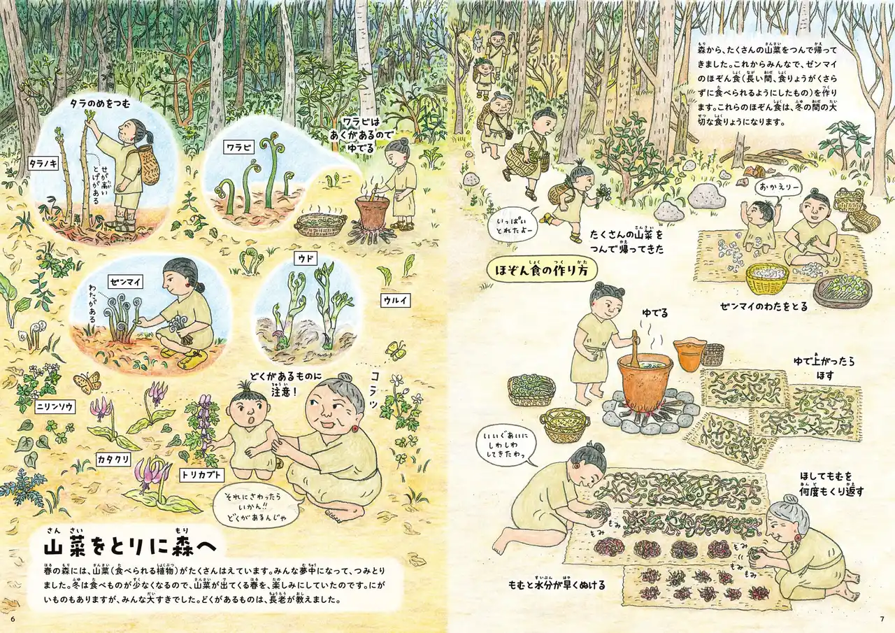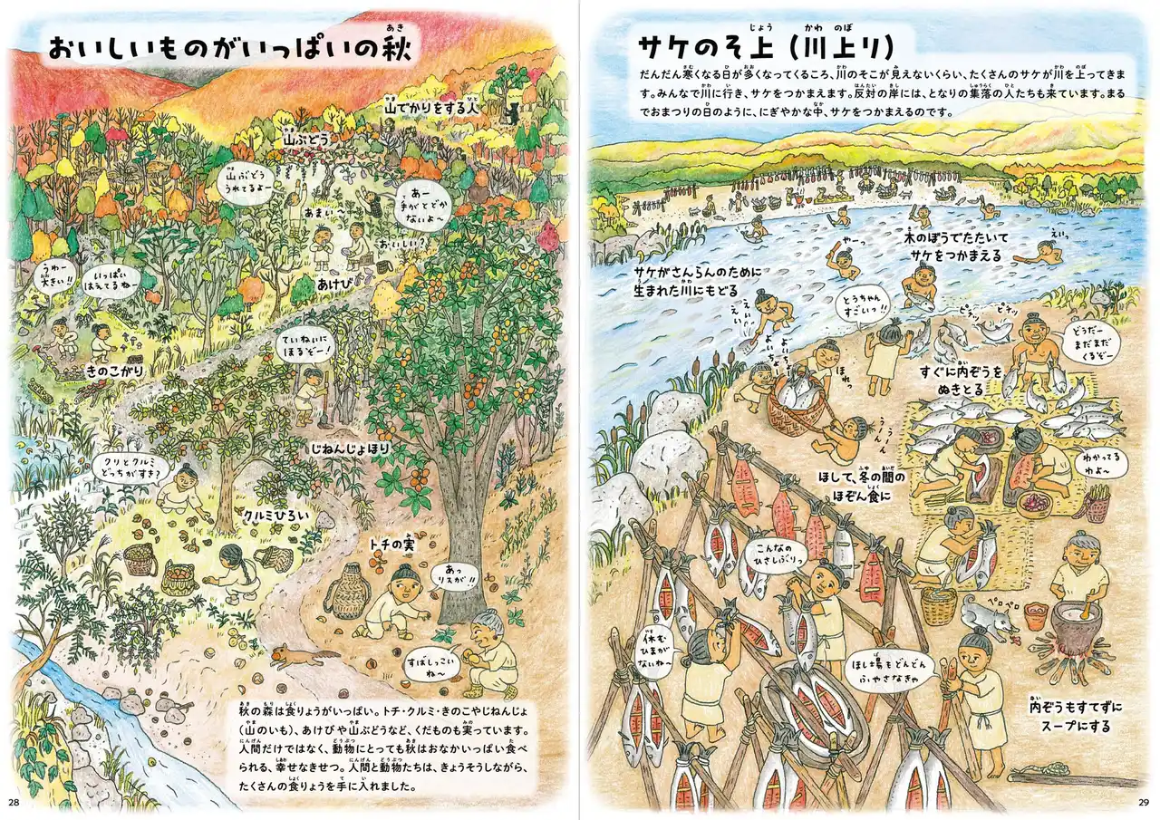 この絵本は縄文時代の日常を描いた絵本だ、春から夏、秋から冬と特別じゃない普通の縄文人の「きっとこうだった」暮らしが続く。山菜を採って保存食にしたり、古くなった道具の手入れをしたり、魚を捌いたり毛皮をなめしたり、働き者がいればサボって何もしない縄文人もいる。本書を読み終わる頃にはこう思うだろう、何千年も前であっても「日常」は今の私たちに確かに繋がっているということを。 縄文ZINE編集長 望月昭秀