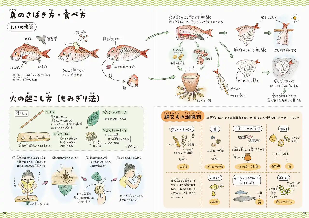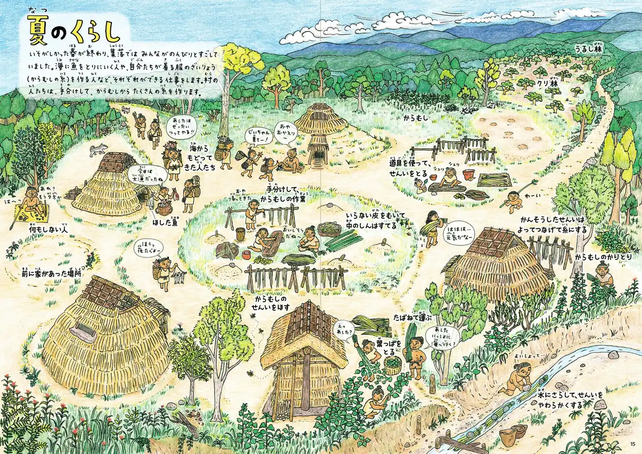 紀元前14,000年ごろから紀元前300年ごろまで、1万年以上続いた縄文時代。動物や魚、木の実などを採集しながら自然と共存し、家や道具など暮らしに使うものは全て手作りしていました。生活の道具だった土器や土偶は驚くほど個性的で、まるで優れた芸術作品ともいえます。縄文時代のファッションや道具の作り方、肉や魚の調理法など、縄文時代の暮らしを見応えのあるイラストで解説します。生き抜く知恵が詰まった、イラストでみる図鑑のような絵本です。 |