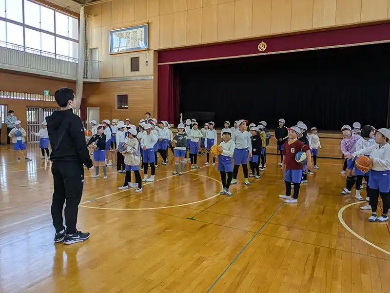 | 安城市立梨の里小学校には、#9 平 寿哉選手も訪問し、バスケットボールと防災を掛け合わせたレクリエーションで、楽しく防災について学びました。 | |||||||||