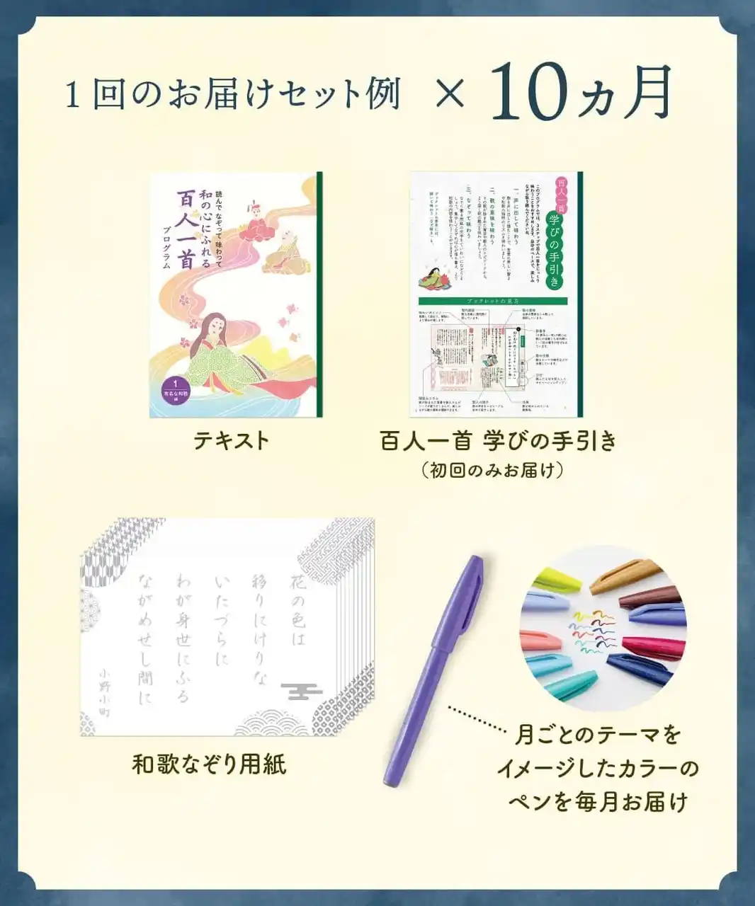 ◆毎月のお届けセット テキスト、和歌なぞり用紙、月ごとのテーマをイメージしたカラーペンが毎月届きます。そのほか、プログラムの楽しみ方や歌がテーマごとにリストになった「百人一首学びの手引き」を初回のみお届けします。 |