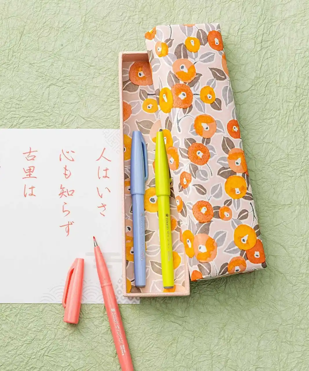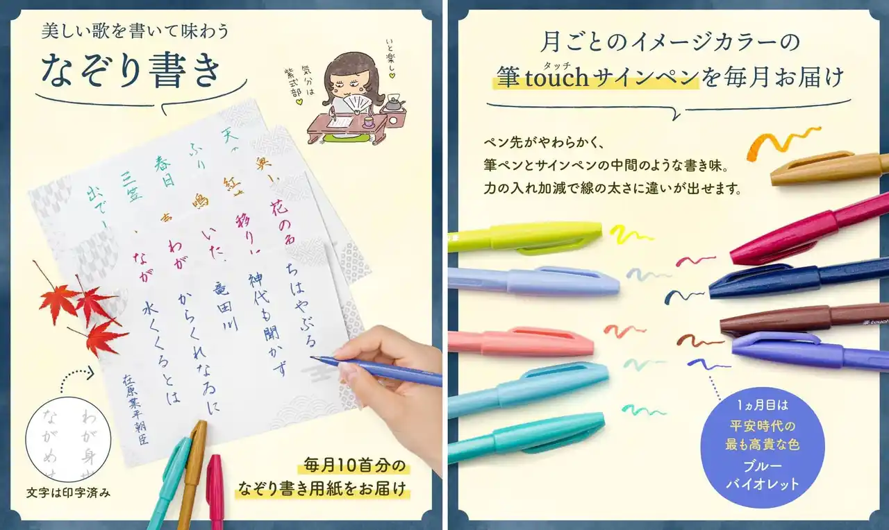 Point3:美しい歌を書いて味わうなぞり書き 各回ごとのテーマに合わせて選んだ色の筆touchサインペンと10首分のなぞり書き用紙をお届け。集中してゆっくりと文字をなぞることで心も落ち着き、歌を一層味わうことができます。 |