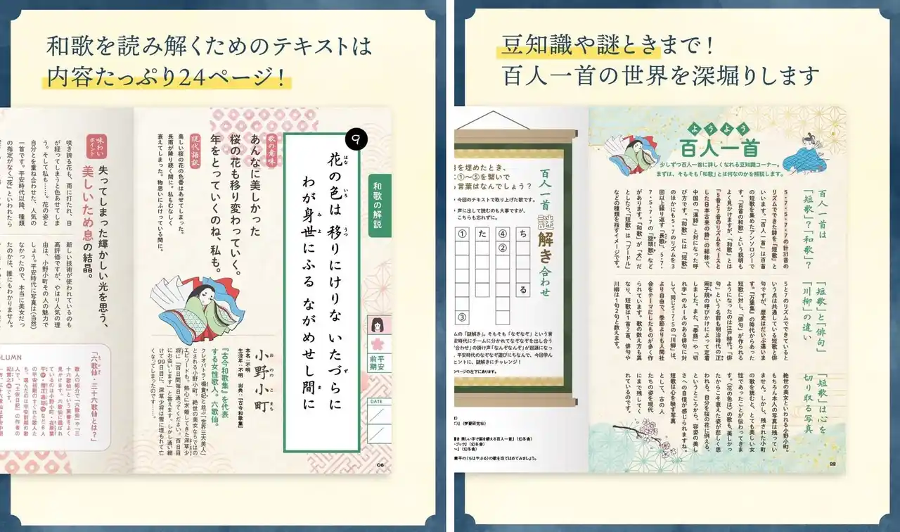 Point2:だからわかる! おもしろい! 充実のテキスト 天野慶さんのわかりやすい解説で、一首ずつじっくり味わえるテキストです。歌を読み解くヒントとなる基礎知識から、誰かに話したくなる豆知識、学んだ内容で楽しめる謎解きまで、百人一首の世界を味わい尽くせるテキストです。内容たっぷりの24ページで、読みごたえも充分。 |