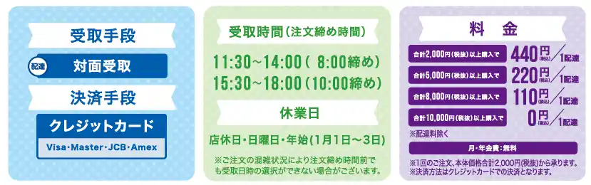 受け取り時間を指定できるため、仕事や育児、介護や天候の悪い日など、店舗に立ち寄ることや時間がないときにも簡単で便利なサービスです。月会費・年会費も無いため、サービス登録いただくことでいつでも気軽に利用できます。 |