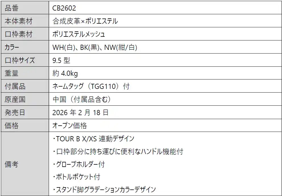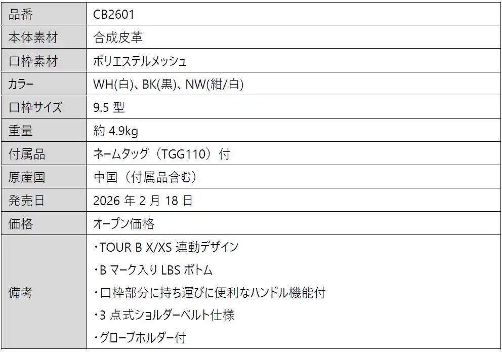 | 『ツアーレプリカモデル』は2026年ツアー開幕より当社契約選手が使用を予定しているキャディバッグのレプリカモデルです。カラーバリエーションは3色で、当社契約選手の使用色は、WH(白)です。今季のツアーモデルシリーズはボール「TOUR B X/XS」連動デザインで、Xをモチーフにした成型パネルやロゴ刺繍が入っています。また、「X」の赤、「XS」の青をアクセントカラーに取り入れています。機能面では、当社独自設計のBマーク入り『LBS(エルビーエス)ボトム※1』を搭載しました。さらに担ぐ際の安定性を確保する3点式ショルダーベルト、持ち運びに便利な口枠部分のハンドル、グローブホルダーなど、プレーヤーの視点に立った機能も備わっています。 | |||