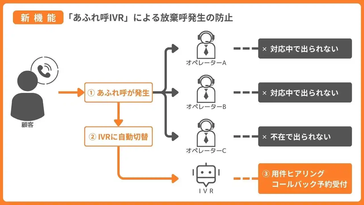 今回新たに実装した「あふれ呼IVR」は、コールセンター/コンタクトセンターにおけるあふれ呼を自動検知し、IVR(自動音声応答システム)での対応に切り替えることによって、用件のヒアリングやコールバック予約の受付を自動化する機能です。 |