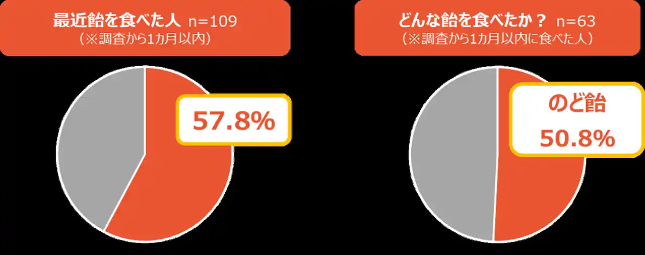 1.最近(調査から1カ月以内に)飴を食べた人は全体の57.8%、そのうち約5割は「のど飴」と回答 |