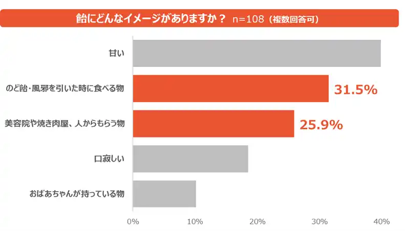「飴から浮かぶイメージ」を尋ねたところ、「甘い」といったイメージの他に、「風邪を引いた時に食べる物」(31.5%)や「美容院や焼き肉屋、人からもらう物」(25.9%)という印象が強いことが分かりました。一時的な用途で「のど飴」を選ぶことや、「人からもらう物」という印象が強いことからも、学生にとって“日常的に食べるお菓子”として選ばれていないことが示唆されました。 |