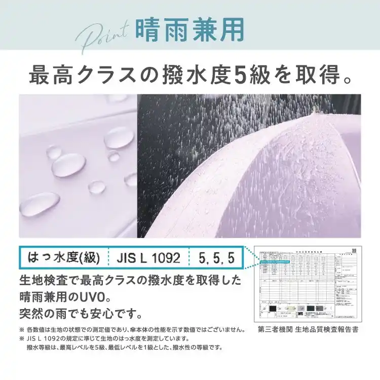 UVOは、生地表面に施した加工により撥水度は最高等級5級※6を取得。雨傘と同等の撥水性を備えています。急な豪雨も、天候にかかわらず降り注ぐ紫外線もしっかりブロックします。 |