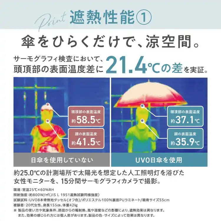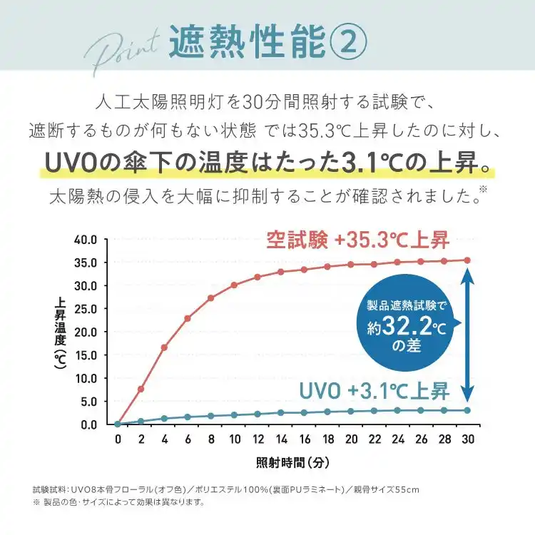 人工太陽照明灯を30分間照射する試験で、遮断するものが何もない状態で測定した熱線受光体の温度は35.3℃上昇したのに対し、UVO傘下に設置した熱線受光体の温度はたった3.1℃の上昇に留まり、太陽熱の侵入を大幅に抑制することが確認できました。 |