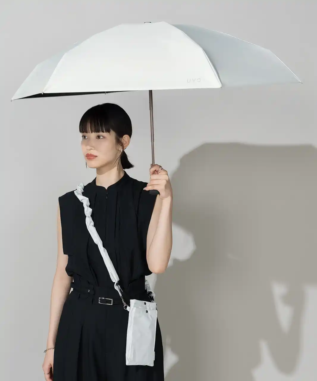 いつでも手軽に紫外線対策が可能な、ショルダーポシェット付きの折りたたみ傘。 |