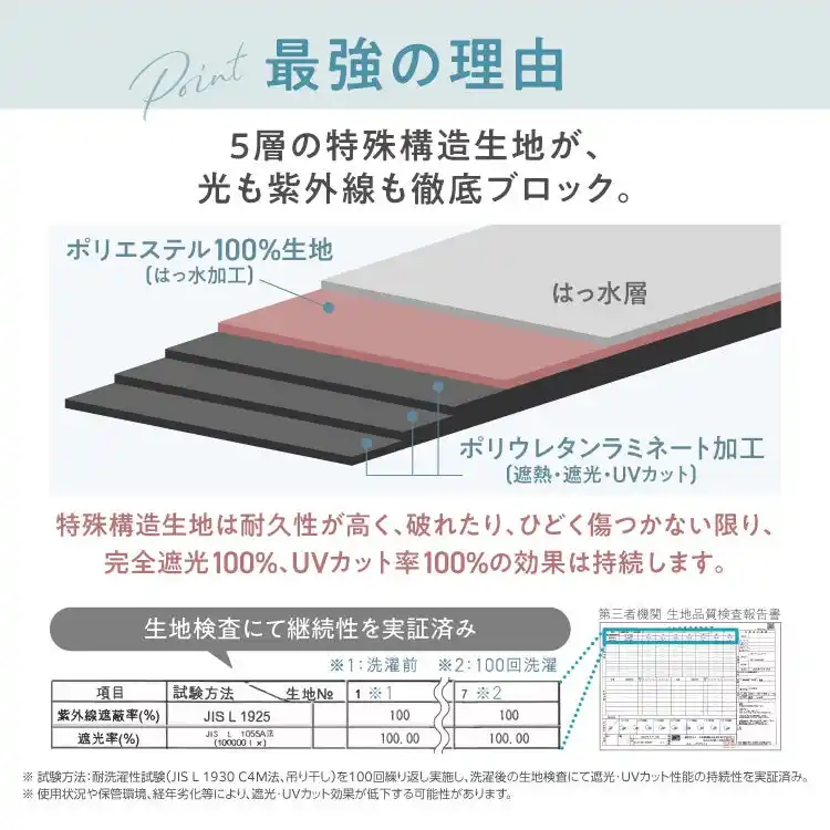 ※3 完全遮光100%:JIS L 1055 A法にて遮光率100%の測定値が出た生地を遮光率100%生地としております。 |