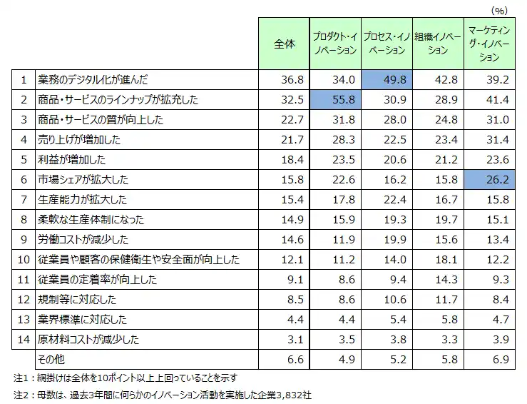 [3] プロダクト・イノベーションとは、自社にとって新しい製品・サービスを市場へ導入することを指す。既存の知識や技術を組み合わせたり、新しい用途へ転用したものを含む。例えば、機能や性能、使いやすさ、ソフトウェア、提供方法(サービス)について、新しいまたは既存の製品・サービスを大幅に改善したもの。有形物だけでなく小売や保険など無形物も含む |