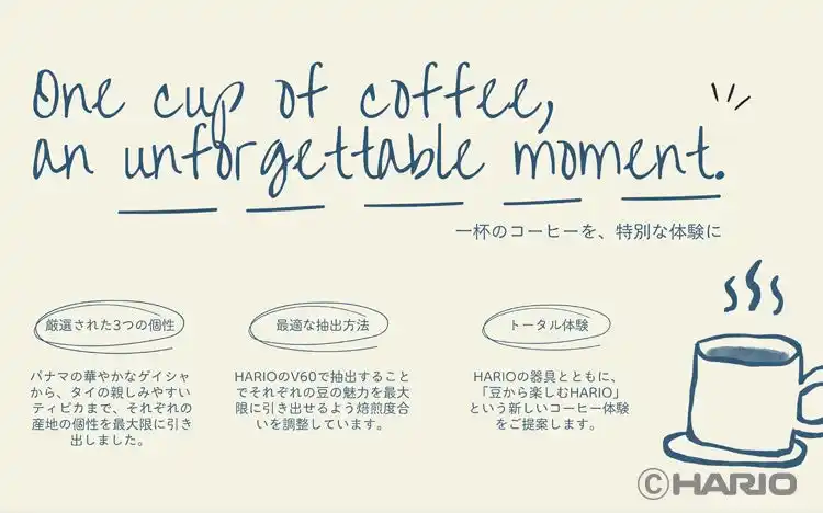 HARIOがセレクトしたのは、パナマとタイという対照的なテロワールから届いた3種のシングルオリジン。それぞれの土地の気候・標高・精製方法が織りなす味わいを、HARIOならではの焙煎設計で最大限に引き出しました。 |