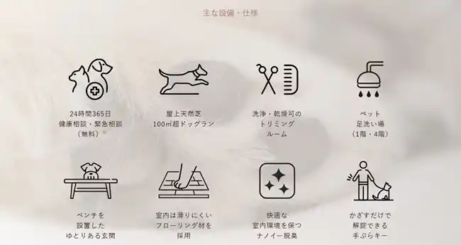 共用施設には天然芝のドッグランやトリミングルームを備え、各住戸にはペットに配慮したフローリングや壁クロス、ナノイー発生器を採用しました。 |