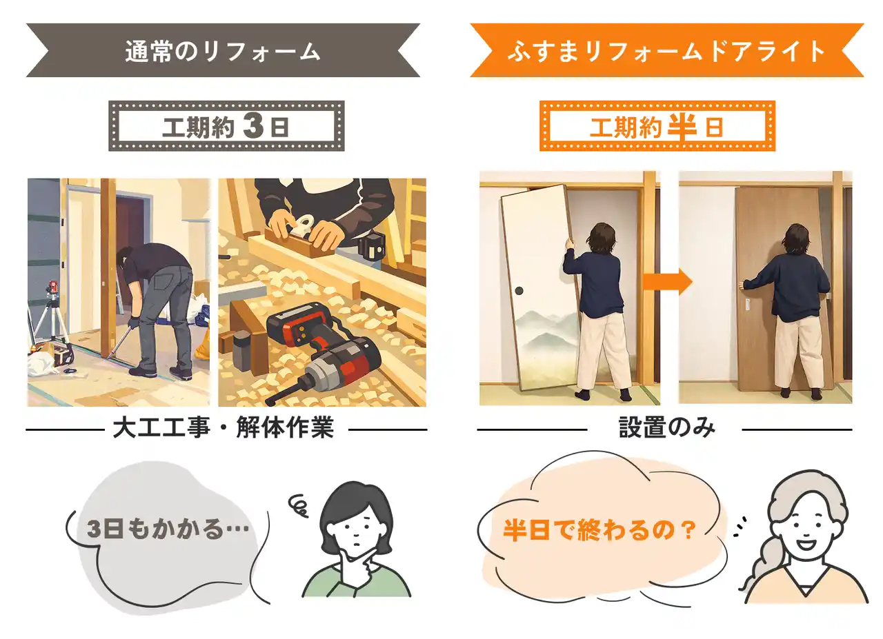 | こうした背景を踏まえ、当社では工事不要で導入できる「ふすまリフォームドアライト」による、短工期・低コストの建具リフォームをご提案しています。 | ||||