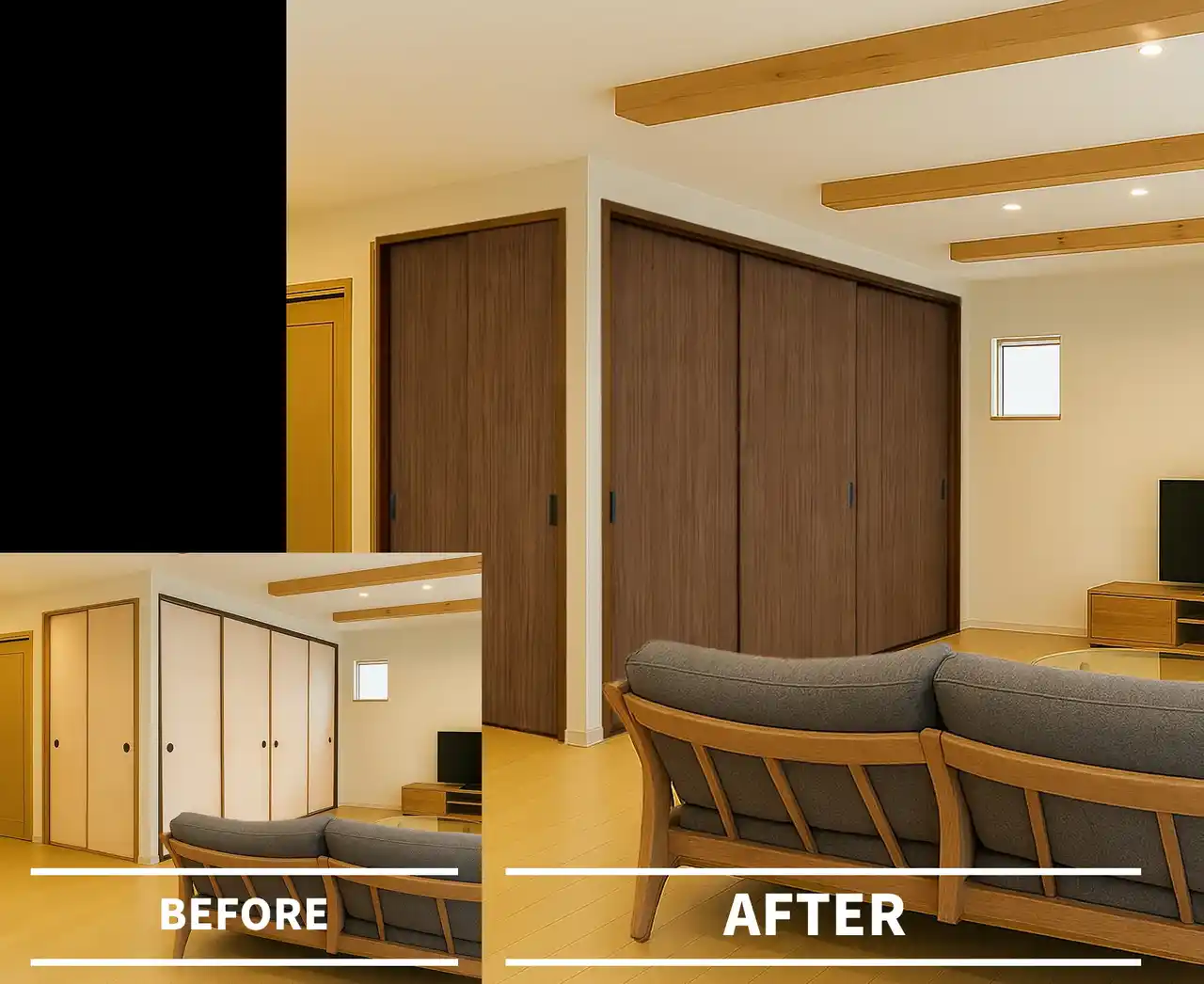 | 和室の出入口から押入れまで同じ仕様で揃えれば、統一感のある洗練された空間に。内見時の第一印象が良くなったり、築年数による古さの印象が和らいだりする効果も期待できます。 | ||||