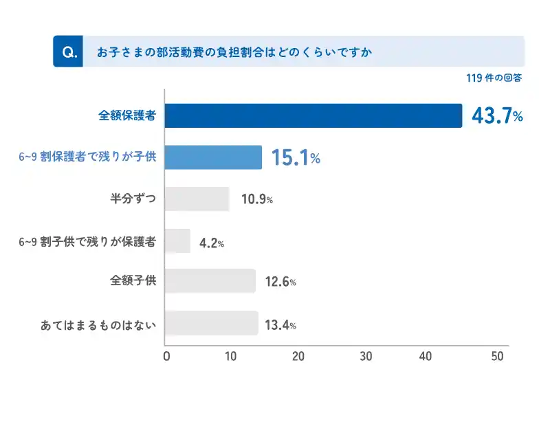 部活動費の負担割合を調査したところ、「全額保護者」が43.7%と最も多く、大学生になっても保護者が費用を全額負担しているケースが多いことがわかりました。「6~9割が保護者で残りが子ども」(15.1%)を含めると、保護者が6割以上負担している家庭は58.8%に上ります。 |