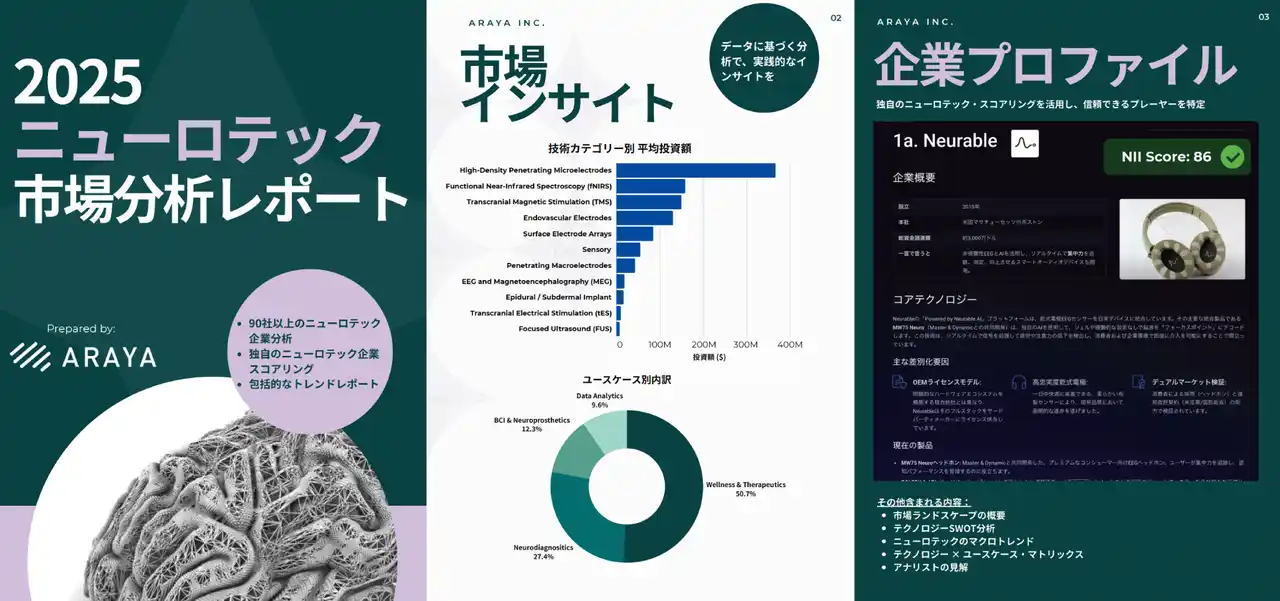 ニューロテック・AIの技術開発・ソリューション提供を手掛ける株式会社アラヤ(所在地:東京都千代田区、代表取締役:金井良太、以下「アラヤ」)は、国内外での研究・開発を通じて蓄積した知見を活かし、ニューロテクノロジー市場を網羅的に分析したマーケットレポート「Neurotechnology Market Landscape Report 2025」の日本語版「ニューロテック市場分析レポート2025」の提供を開始いたしました。また、本レポートの発刊を記念して、2026年2月12日(木)にオンライン解説セミナーを開催いたします。 ニューロテック市場分析レポート2025 URL: https://lp.araya.org/neuroreports/jp