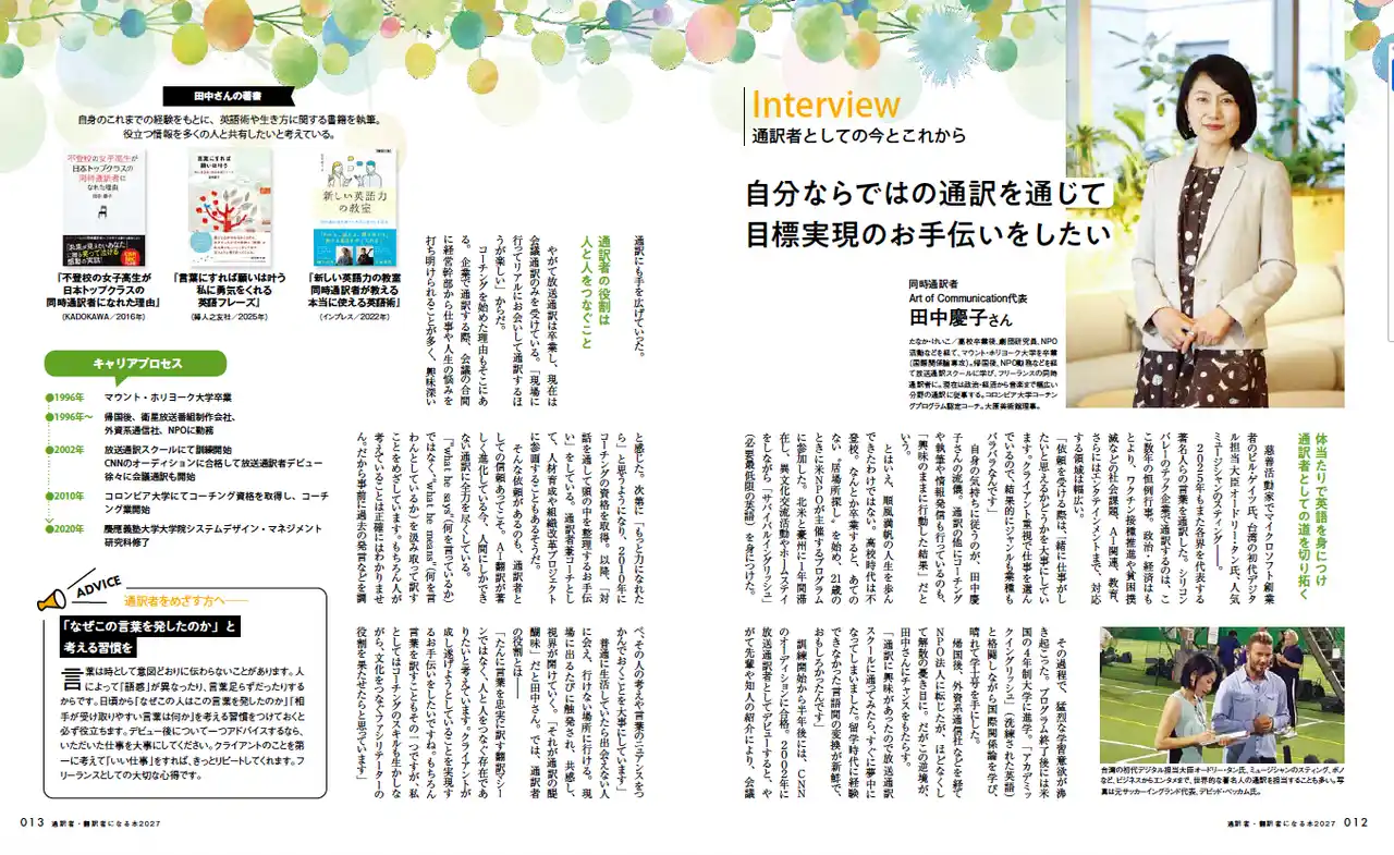 第一線で活躍する通訳者、田中慶子さんのある1日の仕事と、インタビューを掲載しています。 |