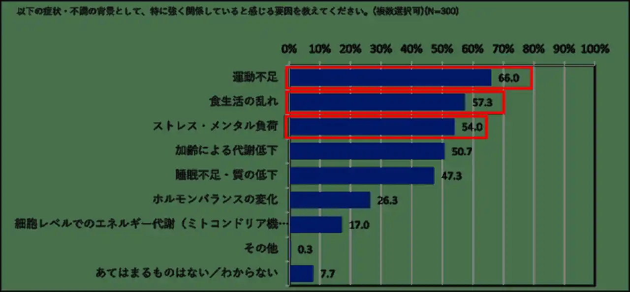 2.「太りやすい・痩せにくい(脂肪燃焼力の低下)」「疲れやすい・疲れが取れにくい(抗疲労力の低下)」といった症状・訴えを持つ患者が増加している背景として、1位は「運動不足」で66.0%、2位は「食生活の乱れ」で57.3%という結果に |