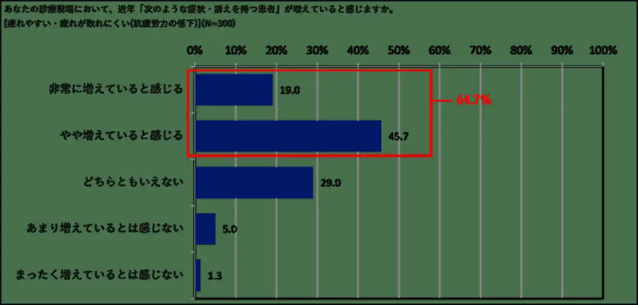 1.診療現場において、近年「太りやすい・痩せにくい(脂肪燃焼力の低下)」「疲れやすい・疲れが取れにくい(抗疲労力の低下)」といった症状・訴えを持つ患者が増えていると6割以上の医師が実感 |