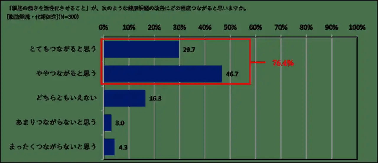 「細胞の働きを活性化させること」が、健康課題の改善にどの程度繋がると思うか医師に質問したところ、「脂肪燃焼・代謝促進」については76.4%、「慢性疲労・倦怠感」については69.3%の医師が改善に繋がると思うと回答。「細胞の働きを活性化させること」が健康課題の改善において深く関与していることがうかがえる。 |