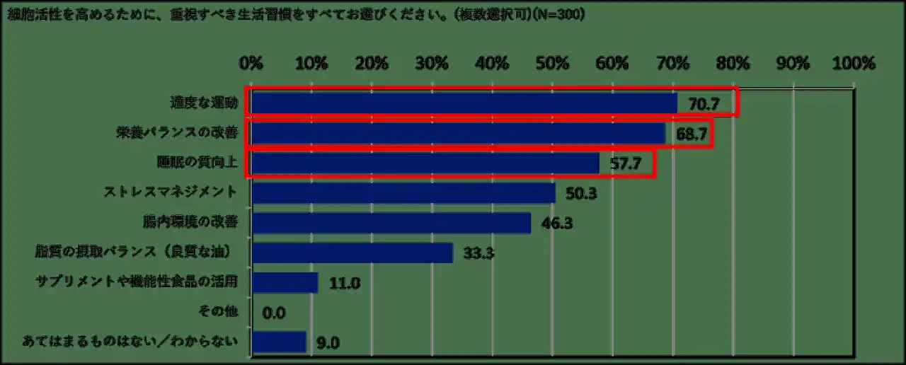 細胞活性を高めるために、重視すべき生活習慣について医師に質問したところ、1位「適度な運動」で70.7%、2位「栄養バランスの改善」で68.7%、3位は「睡眠の質向上」で57.7%という結果となった。 |
