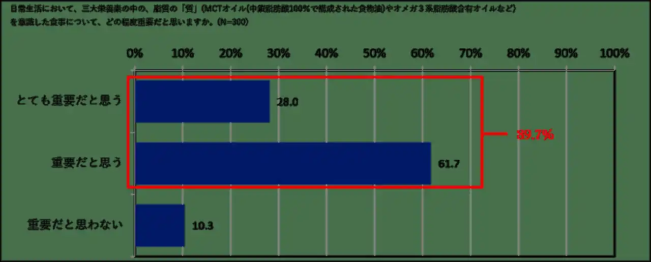 日常生活において、三大栄養素の中の、脂質の「質」(MCTオイル(中鎖脂肪酸100%で構成された食用油)やオメガ3系脂肪酸含有オイルなど)を意識した食事について、どの程度重要だと思うか質問したところ、89.7%の医師が重要だと思うと回答した。 |