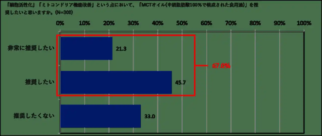 「細胞活性化」「ミトコンドリア機能改善」という点において、「MCTオイル(中鎖脂肪酸100%で構成された食用油)」を推奨する医師は67.0% |