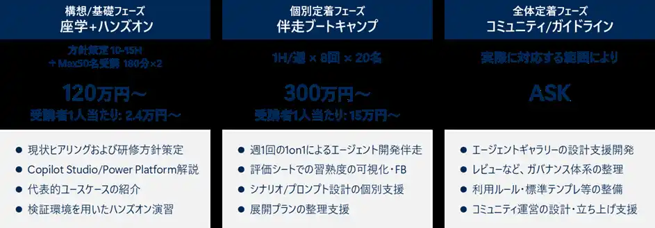 本サービスは Microsoft 365 を活用する企業の業務効率化・生産性向上を目的に、Microsoft Copilot Studioを用いた約2.5カ月間の伴走型研修です。AIのスキル習得のための座学・ハンズオン・1on1伴走型ブートキャンプの実施に加え、評価測定や社内コミュニティの構築など、継続的なスキル習得と組織浸透を支援するプログラムなども提供し、課題に応じて適切なサービスを提供します。 |