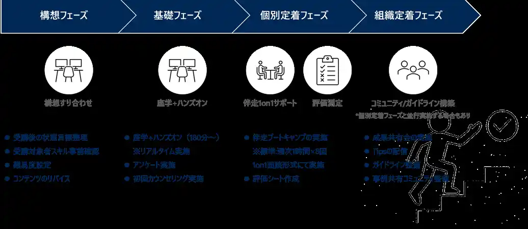 個別定着:当社の専門家が1on1を実施、業務を題材にした開発状況を確認し支援(8週間・1時間/1日あたり) |
