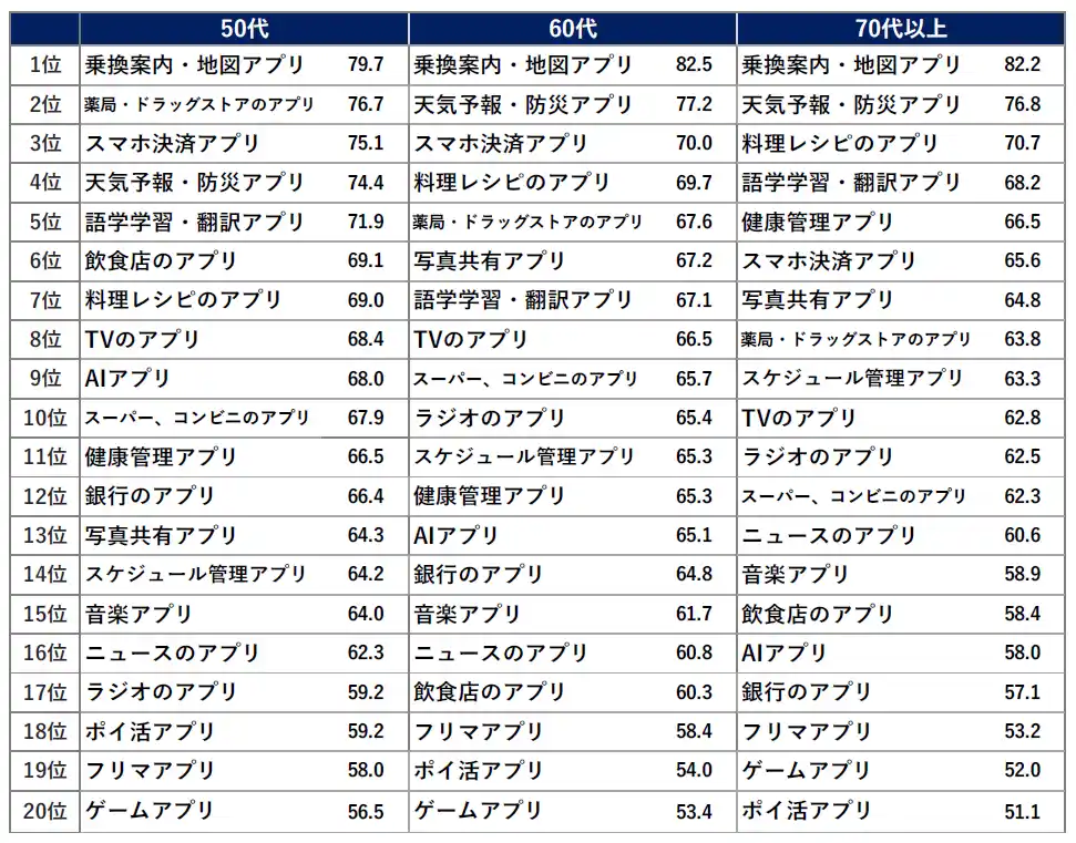 「すすめたいアプリはない」と答えた人が4.4%にとどまった点も象徴的です。75歳の方が友人とスマホ決済で送金し合う事例からは、50代に限らず70代以上でも、自分の生活を支えるアプリを自覚的に取り入れ、その価値を実感していることがうかがえます。自由記述には「行動範囲が広がった」「外出がラクになった」という声もあり、アプリがこの世代の生活をやさしく後押ししていることが伝わってきます。 |