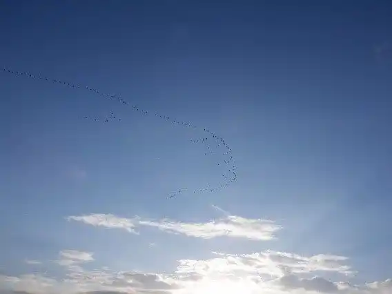 ねぐらの片野鴨池と採餌場所の坂井平野の中間地点である北潟湖では、竿やカギのような形の隊列を組んだ雁の飛来を見ることができます。国の天然記念物に指定されているマガンの雁行を見ることができるのは、全国でも数少ないですが、北潟湖では壮大な雁行を見ることができます。 |