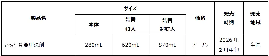 P&Gジャパン合同会社(本社:神戸市)は、無添加*¹衣料用洗剤・柔軟剤ブランド『さらさ』から、衣料用洗剤・食器用洗剤の2つのカテゴリから新製品を発売いたします。衣料用洗剤は、衣類と肌の摩擦を軽減し、大人の乾燥肌を優しく包み込む「衣料用洗剤 大人のさらさ」を新発売いたします。さらに、「さらさ 食器用洗剤」も新登場。デリケートな手肌を考えた処方なのに、食器用洗剤のジョイと共同開発で、油汚れもスッキリ落とします。「衣料用洗剤 大人のさらさ」は2026年2月上旬、「さらさ 食器用洗剤」は2026年2月中旬より全国で発売開始いたします。 |