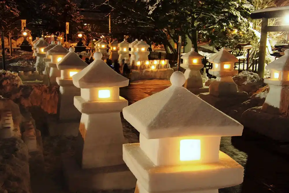 上杉神社境内や松が岬公園一帯を主会場に約200基の雪灯篭と1,000個の雪ぼんぼりに光が灯されます。やわらかな灯りが揺らぐ情景には温もりと美しさがあり、幻想の詩情を添えて人々をメルヘンの世界へと誘います。 |